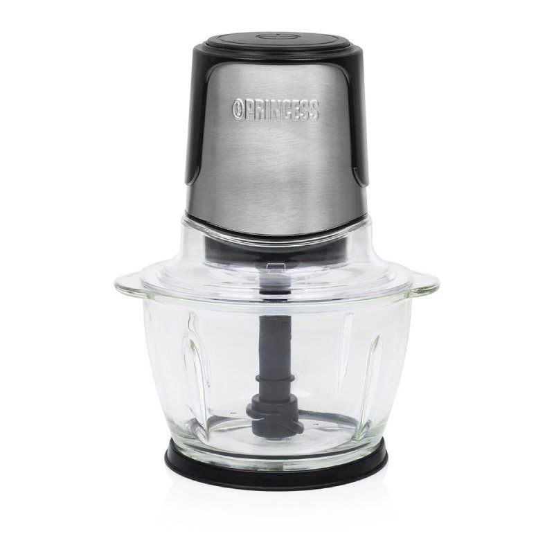 'Las 2 cuchillas de acero inoxidable pican fácilmente distintos 'ingredientes. Con el práctico recipiente de cristal de 1 l de capacidad,' podrá preparar raciones grandes de una sola vez. ¿Le gustaría preparar 'un recipiente de guacamole grande o una crema para untar en los 'sándwiches? No es problema para la picadora Princess Power. Además, la 'picadora permanece estable cuando está picando gracias a su base 'antideslizante.'