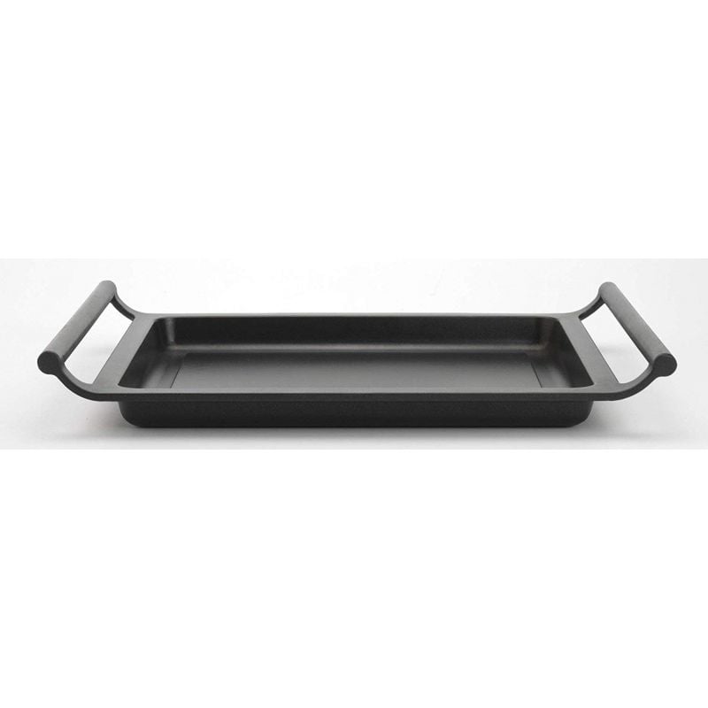 La parrilla lisa Efficient es ideal para cocinar los alimentos, tanto en el fuego como en el horno, de una forma muy sana y sencilla. Su amplio fondo difusor es perfecto para poder cocinar a la vez tanto la carne o el pescado como la guarnición con la que se quiera acompañar. De forma rápida, sin apenas grasas y sin que se pegue nada, podrás preparar unas comidas y cenas de lo más deliciosas. Pincelando la parrilla con el aceite habitual o bien con uno aromatizado, podrás darle un punto diferente a la carne o al pescado en cada ocasión. Platos sabrosos y saludables con un toque especial como unas rodajas de merluza con unos espárragos verdes y un poco de aceite de gambas, un entrecot de ternera con las setas que prefieras y aceite de trufa o de boletus, una parrillada de verduras variadas con aceite de ajo, unos calamares con unas láminas de calabacín con aceite de oliva o unos mejillones abiertos en el grill con un poco de pimienta. Su superficie lisa te permite utilizarlo incluso como bandeja para hornear tartas de hojaldre, galletas, pizzas, empanadas o una focaccia de lo más apetitosa. Recetas sanas y deliciosas en una parrilla muy versátil, robusta y duradera con la que podrás cocinar de forma eficiente y que además se limpia muy fácilmente.