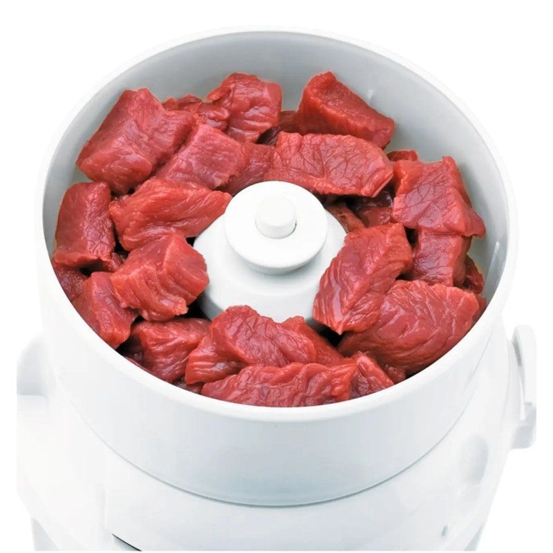Esta picadora con sistema 1-2-3 te ayuda a picar y cortar en trozos pequeños cualquier tipo de ingrediente con tan solo ejercer presión en la parte superior. Pica cebolla, ajo, carne, frutos, secos, hierbas aromáticas y verduras en cuestión de segundos para ahorrar tiempo en la preparación de tus recetas favoritas. Cuenta con una capacidad de 200 g y sus 800 W de potencia te permiten picar sin esfuerzo, lo que te será de gran ayuda en la cocina diaria. Gracias al sistema de seguridad de la tapa, puedes usarla con total tranquilidad. Además, la cuchilla es extraíble, lo que facilita en gran medida la limpieza del producto.