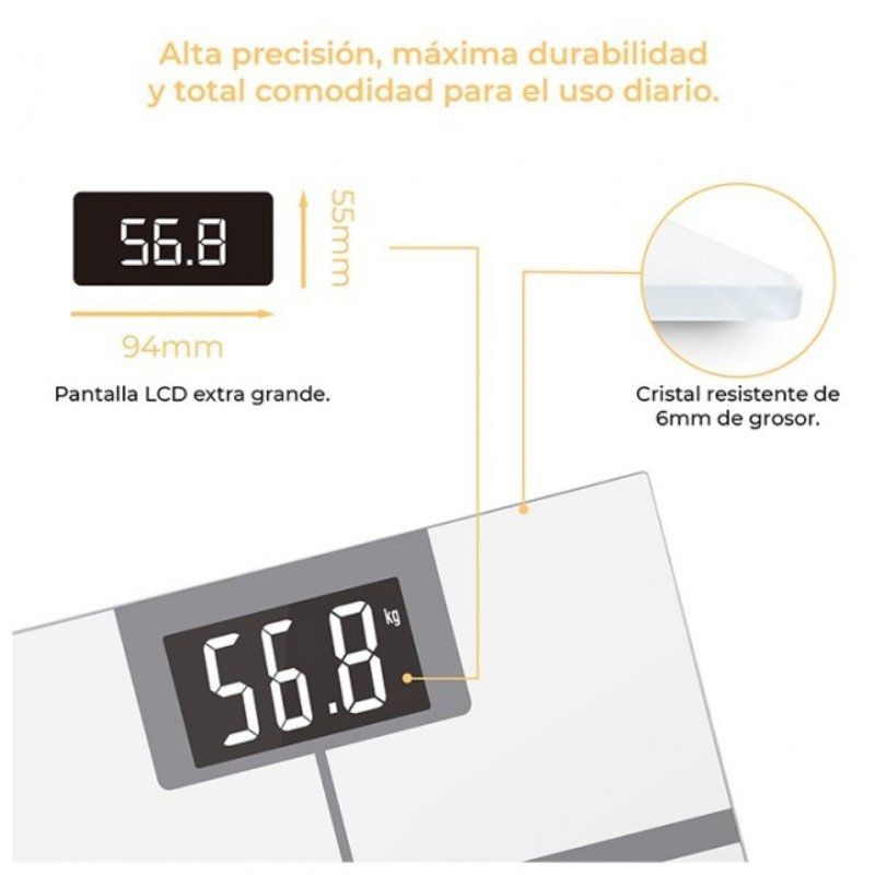 'Gracias a su plataforma de vidrio templado es capaz de soportar grandes presiones y tiene una resistencia extrema para todo tipos de pesos. Así, es apta para hacer un uso intensivo de ella, controlando el peso corporal de manera frecuente en el día a día y gestionar las variaciones producidas por nuestra actividad diaria