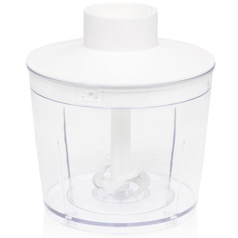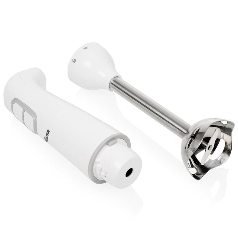 Completa batidora de mano con picadora, varillas y vaso medidor. La batidora de mano tiene 350 W de potencia y varilla de acero inoxidable extraíble y fácil de limpiar. La picadora incluye cuchillas de acero inoxidable, perfectas para picar verduras.