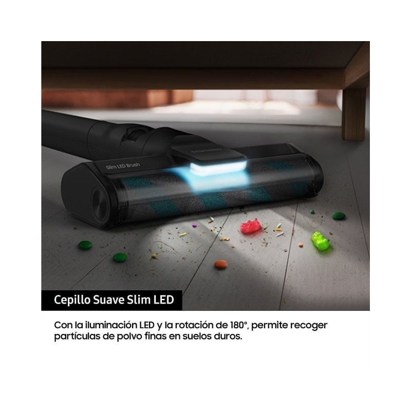 'Recoge el polvo fino de los suelos duros con el cepillo Slim LED con 'iluminación LED para resaltar el polvo en las zonas oscuras. Es más fino' y ligero, rota a 180° para que sea fácil manejarlo e incluye un rodillo' antienredos en la parte delantera que reduce la cantidad de cabe'
