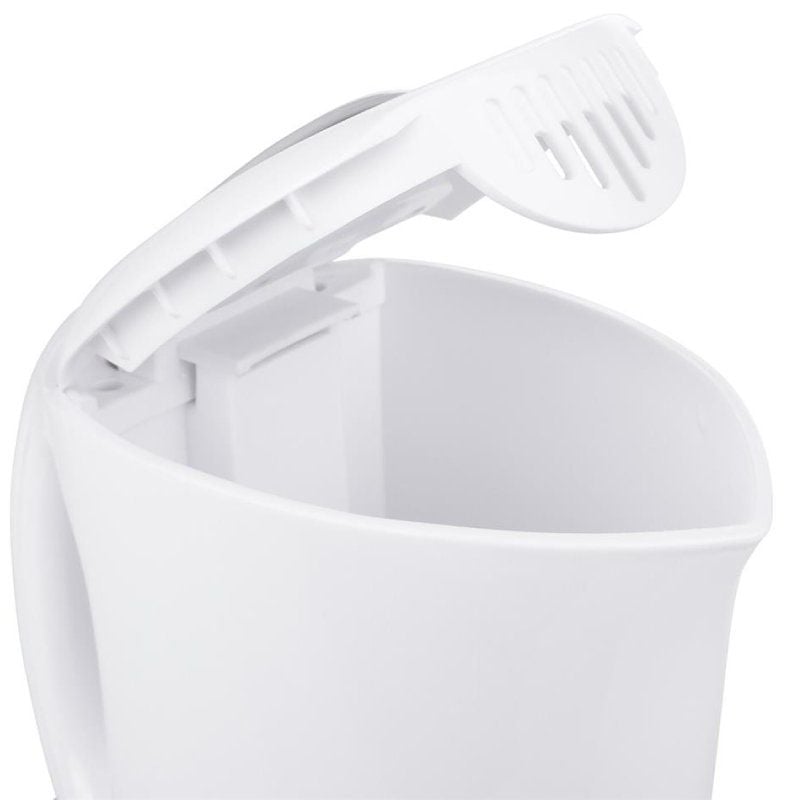 ' - Hervidora de agua práctica y compacta con una carcasa blanca de plástico. '